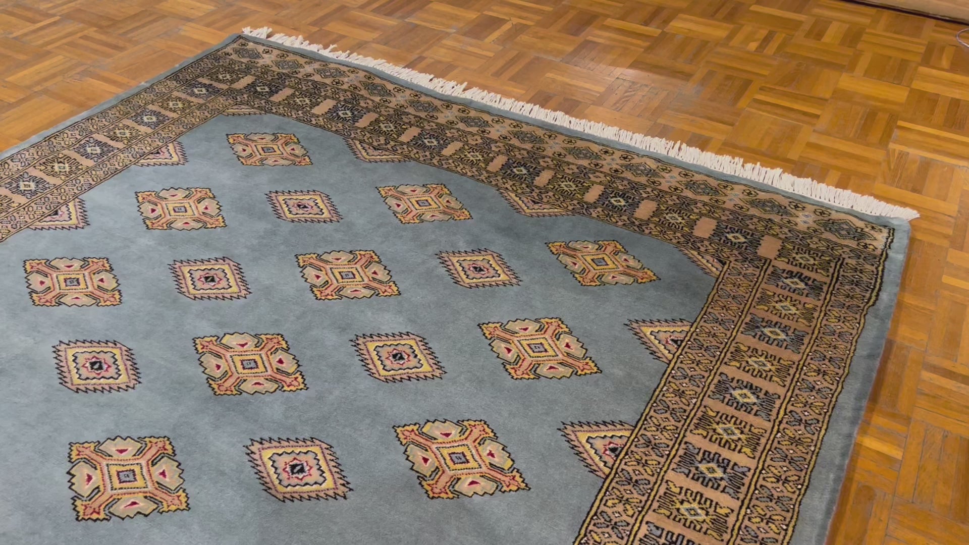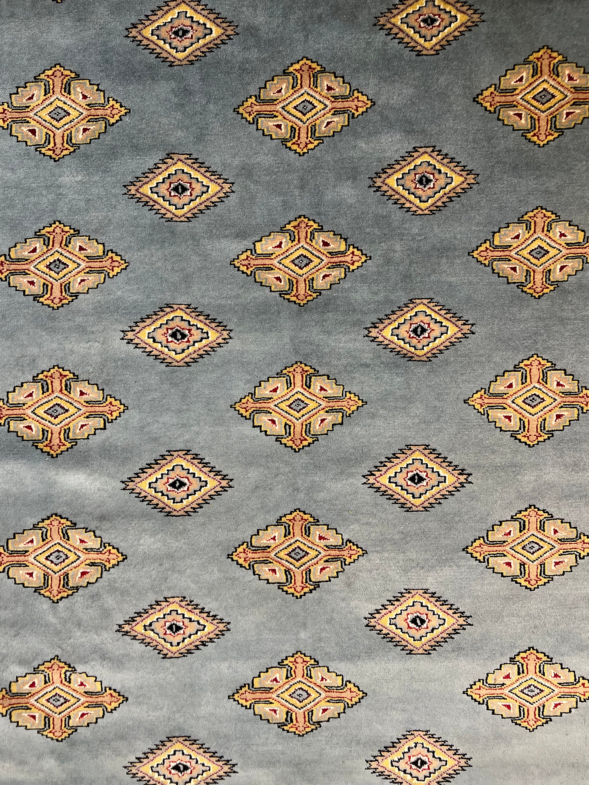 Les tapis Boukhara contiennent un motif répétitif connu sous le nom de « gul » que l'on trouve couramment sur son champ principal dans des tailles plus grandes et sur ses bordures dans des tailles plus petites. UN gul (également orthographié comme gol, gol ou gül ) est un motif en forme de médaillon que l'on retrouve généralement dans les tapis traditionnels tissés à la main d'Asie centrale, d'Asie occidentale et de certaines parties d'Asie du Sud. Ces motifs sont très anciens et d’origine animiste, antérieurs aux époques islamique et chrétienne. L'origine du terme est incertaine et elle est encore contestée à ce jour. En farsi, la langue parlée dans l'Iran d'aujourd'hui, on dit que cela signifie « fleur » ou « rose ». Pendant ce temps, dans la langue turque, le terme gül signifie une « rose » ou une « cocarde » ou même un « lac ».