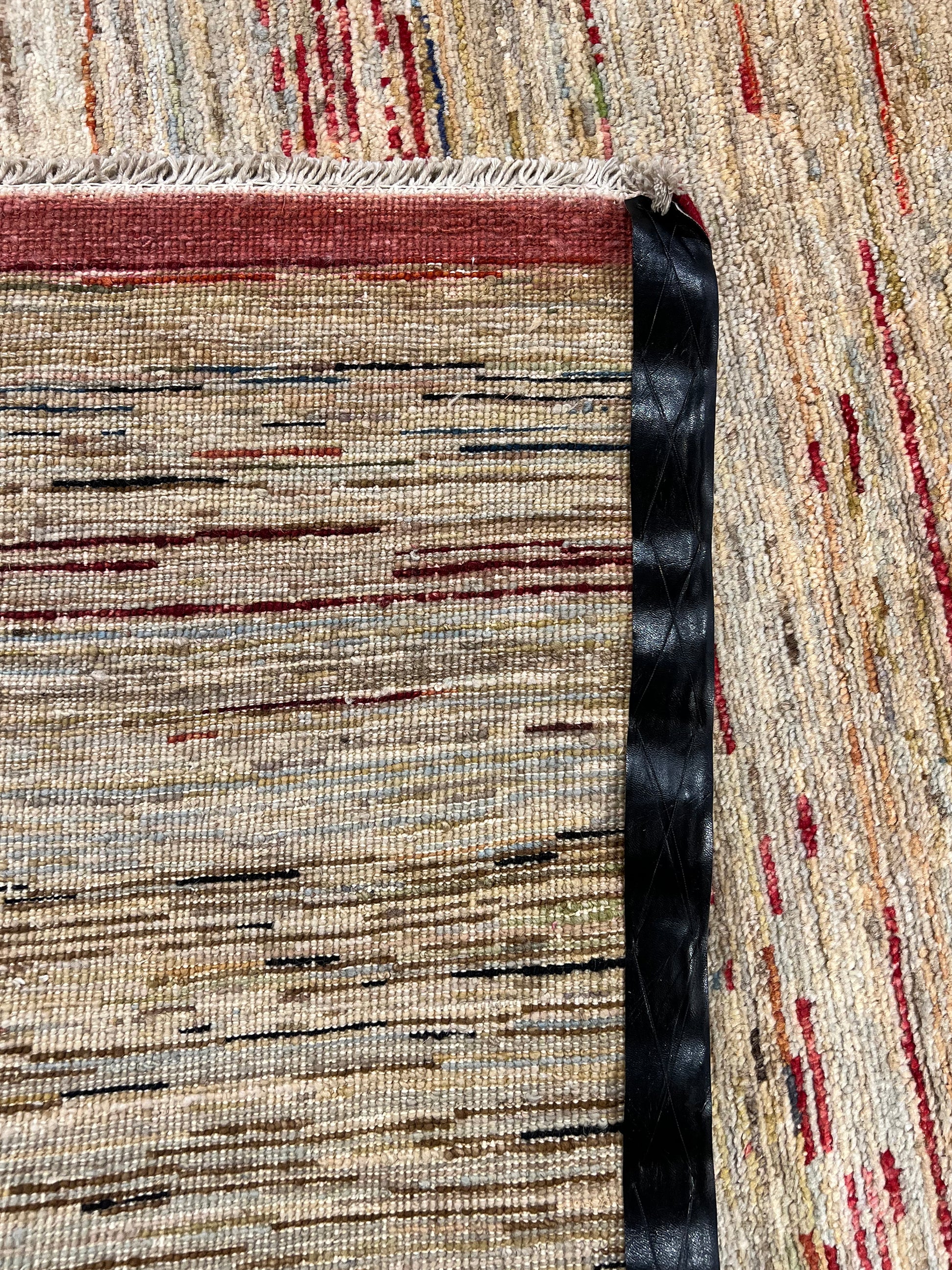 Attention, cette pièce présente un côté clair et un côté plus foncé dû au sens de son poil de laine (nap). Lorsque quelqu'un se tient directement devant le poil, face à ses fibres, celui-ci paraît plus sombre et vice versa. Cette caractéristique est l’une des parties les plus fascinantes d’un tapis fait main. Il offre au propriétaire la possibilité de changer l’apparence de son espace simplement en changeant la façon dont le tapis est placé dans la pièce.