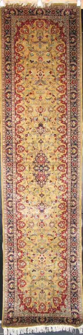 Les tapis de Tabriz sont de format allongé et relativement étroits. Au centre, un médaillon en étoile ou frangé, caractéristique majeure de ces tapis, est accompagné de quarts de médaillon qui ornent ses coins. Le fond se compose généralement d'un treillis floral régulier. Ces tapis se rattachent par les motifs de leurs médaillons aux emblèmes de tribus turkmènes qui contrôlaient Tabriz au XVe siècle. Ce nouvel art de la cour persane n'est donc pas totalement étranger à l'héritage turc, et ce mélange est réflété dans la composition de ces tapis. Pour en savoir plus sur l'histoire des tapis persans, veuillez s.v.p visiter notre section: tapis iraniens.