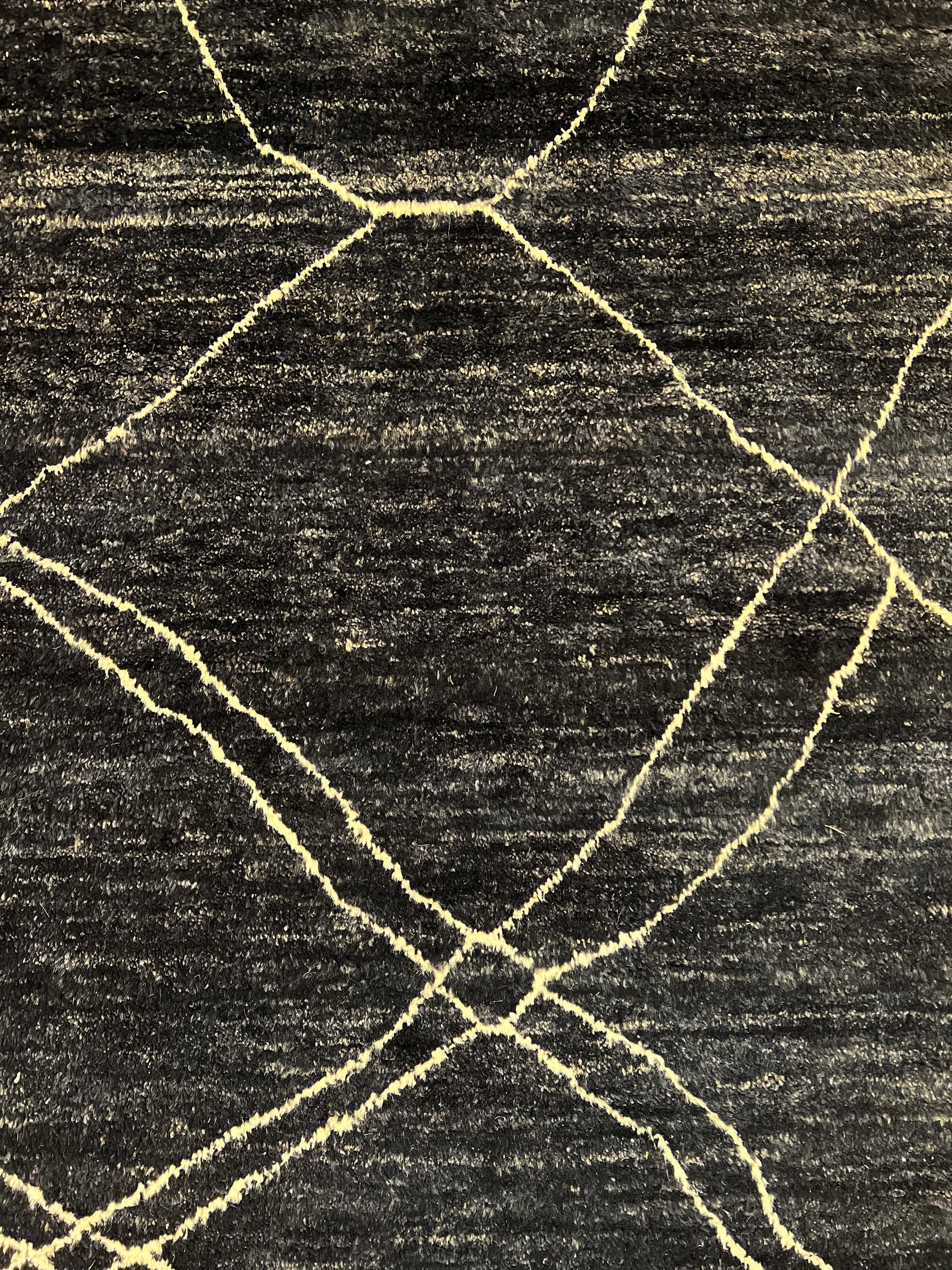 Historians generally agree that there are five main categories of Moroccan carpets: Middle Atlas carpets, the High Atlas (often yellow and bright, knotted lambswool), Rabat, Morocco, and the Eastern Atlantic plains. The Eastern Atlantic plains, represented by the Haouz of Marrakech and Chiadma coastal tribe carpets, is perhaps the most suprising. It is characterized by a lack of structure: the motifs are irregular, the layout is deliberately confusing, and the wool is uneven. These are mysterious carpets that seem to draw from a primitive source.