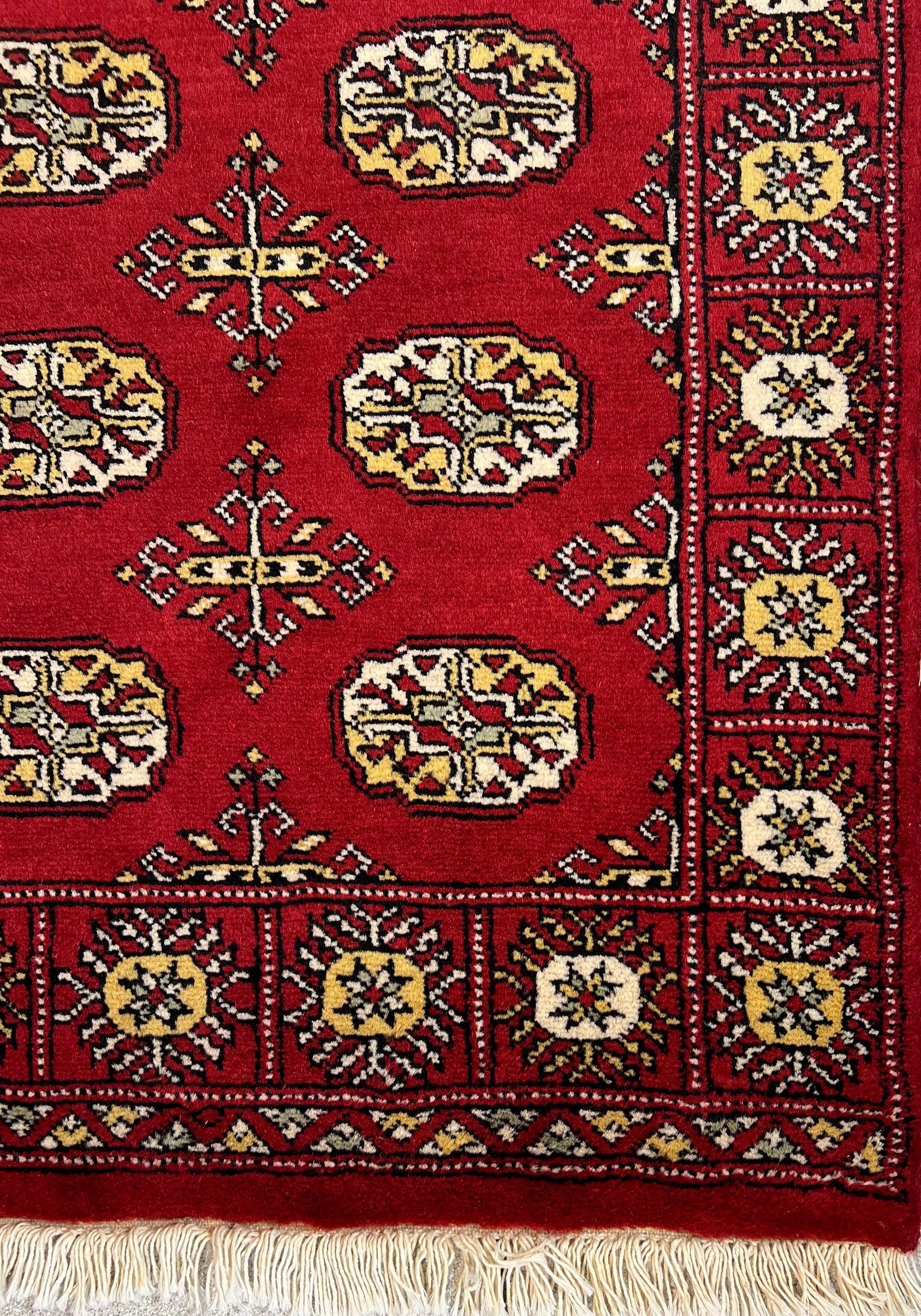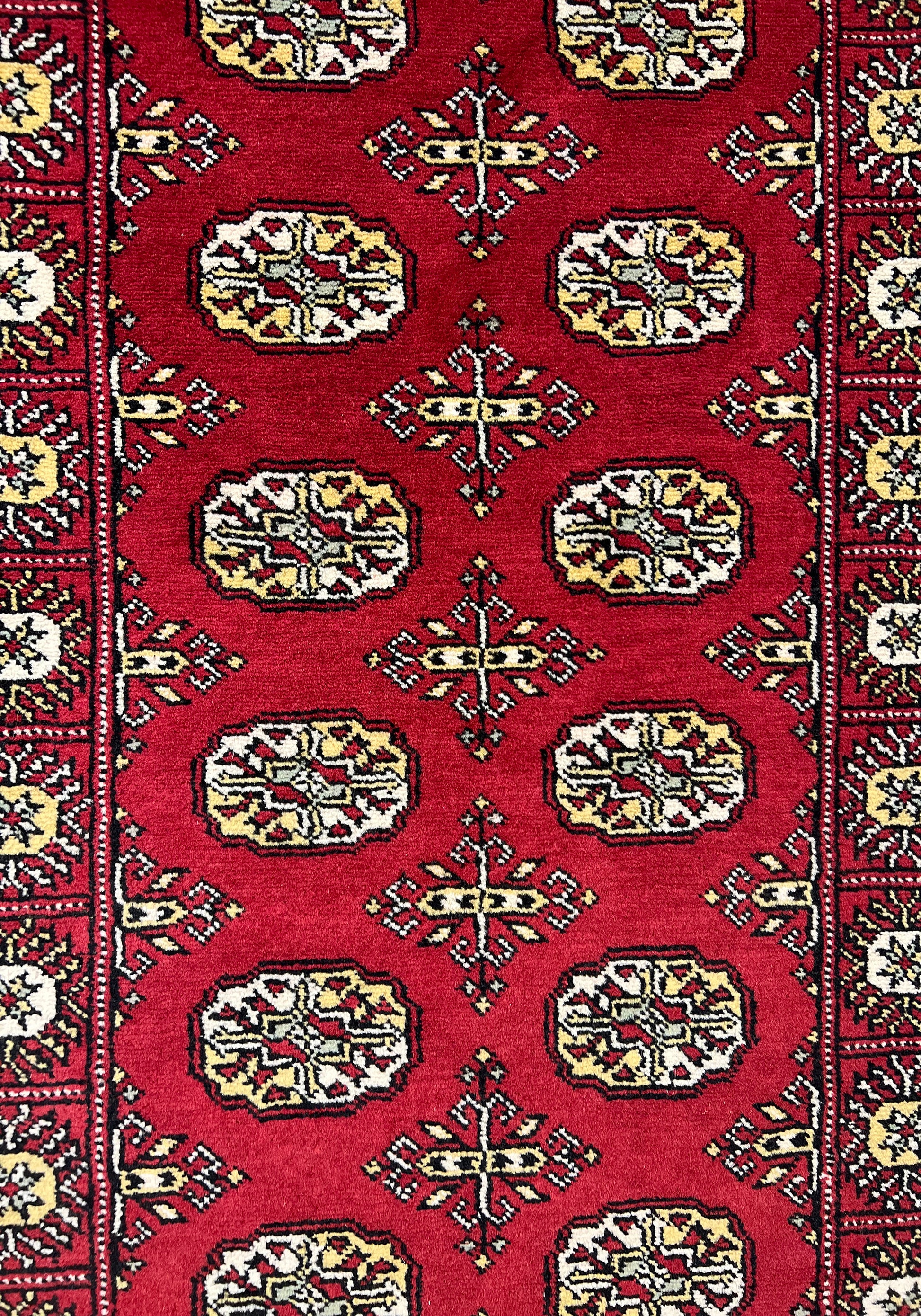 Bokhara is a term widely used in the West to refer to carpets and rugs made by various Turkmen tribes of Central Asia. Their history dates back centuries. The Turkomans were situated to the north of what is now called Afghanistan. During the early 1900s, the name of Bukhara, a city in Uzbekistan, was given to these rugs. The Turkomans were an industrious people who would barter their trade for food, clothing, etc. As a result, their weaving would invariably show up in bazaars (a type of market) in cities such as Bukhara, hence the name. The city did serve as a transit point for some Turkmen rugs on their way to the West. Nowadays, Bokharas are considered among the finest carpets in Afghanistan and Pakistan, distinguished by their extra fine knots and soft, silky touch. They are also popular worldwide due to their suitability to almost any space.