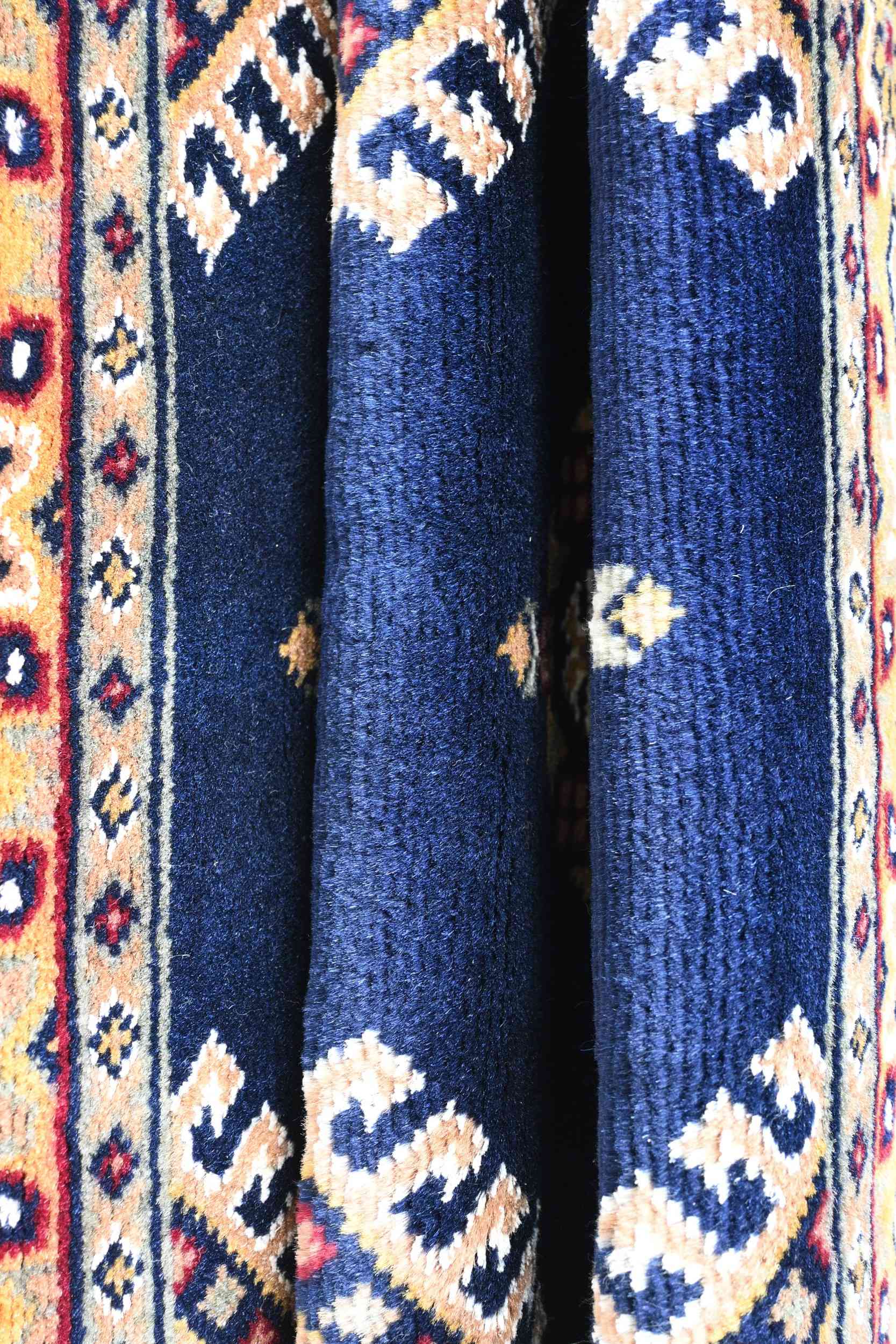 Bokhara is a term widely used in the West to refer to carpets and rugs made by various Turkmen tribes of Central Asia. Their history dates back centuries. The Turkomans were situated to the north of what is now called Afghanistan. During the early 1900s, the name of Bukhara, a city in Uzbekistan, was given to these rugs. The Turkomans were an industrious people who would barter their trade for food, clothing, etc. As a result, their weaving would invariably show up in bazaars (a type of market) in cities such as Bukhara, hence the name. The city did serve as a transit point for some Turkmen rugs on their way to the West. Nowadays, Bokharas are considered among the finest carpets in Afghanistan and Pakistan, distinguished by their extra fine knots and soft, silky touch. They are also popular worldwide due to their suitability to almost any space.