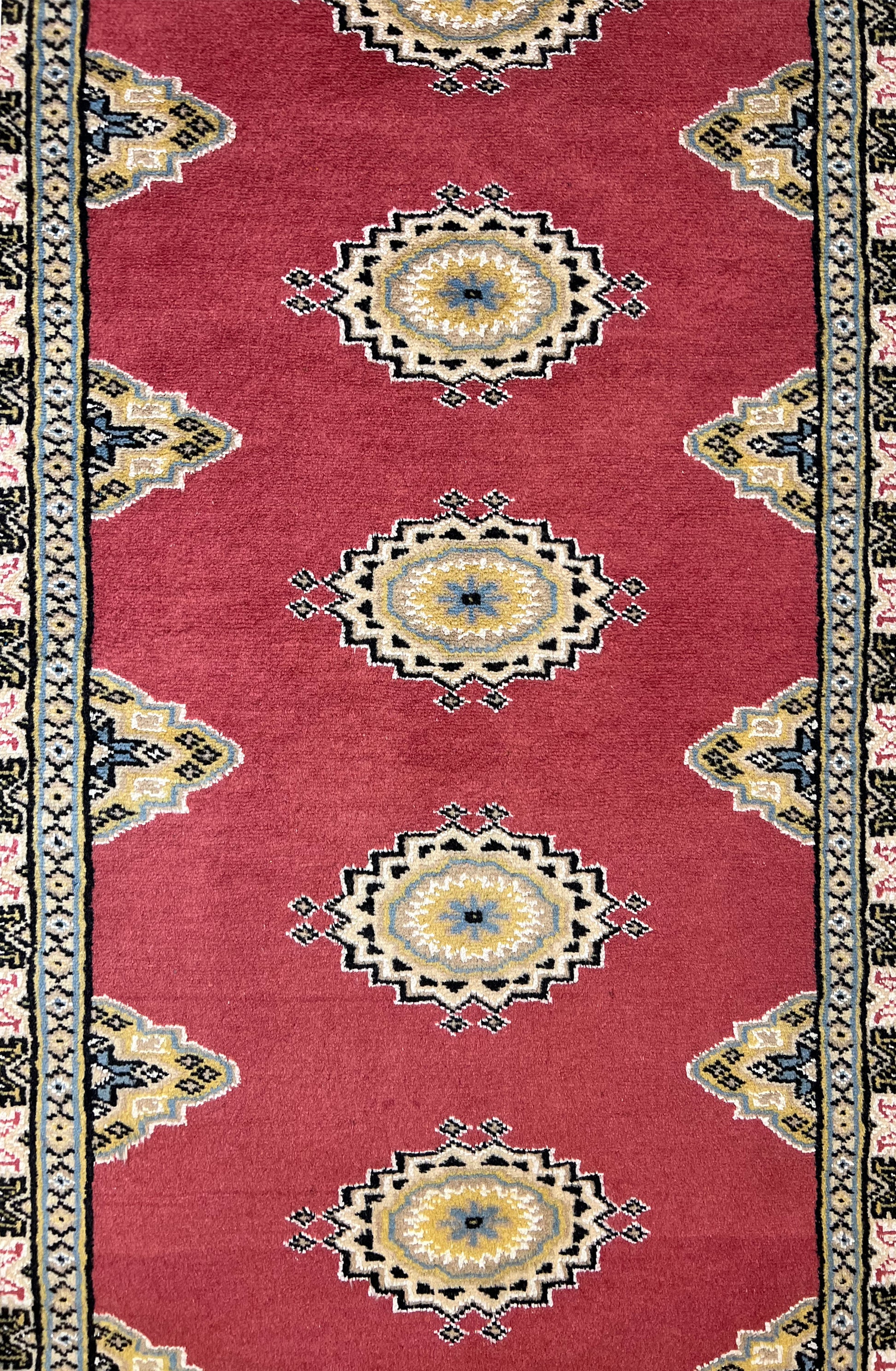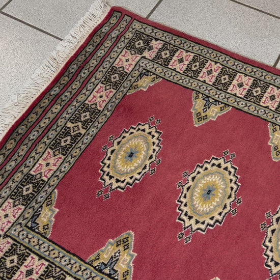 Bokhara is a term widely used in the West to refer to carpets and rugs made by various Turkmen tribes of Central Asia. Their history dates back centuries. The Turkomans were situated to the north of what is now called Afghanistan. During the early 1900s, the name of Bukhara, a city in Uzbekistan, was given to these rugs. The Turkomans were an industrious people who would barter their trade for food, clothing, etc. As a result, their weaving would invariably show up in bazaars (a type of market) in cities such as Bukhara, hence the name. The city did serve as a transit point for some Turkmen rugs on their way to the West. Nowadays, Bokharas are considered among the finest carpets in Afghanistan and Pakistan, distinguished by their extra fine knots and soft, silky touch. They are also popular worldwide due to their suitability to almost any space.