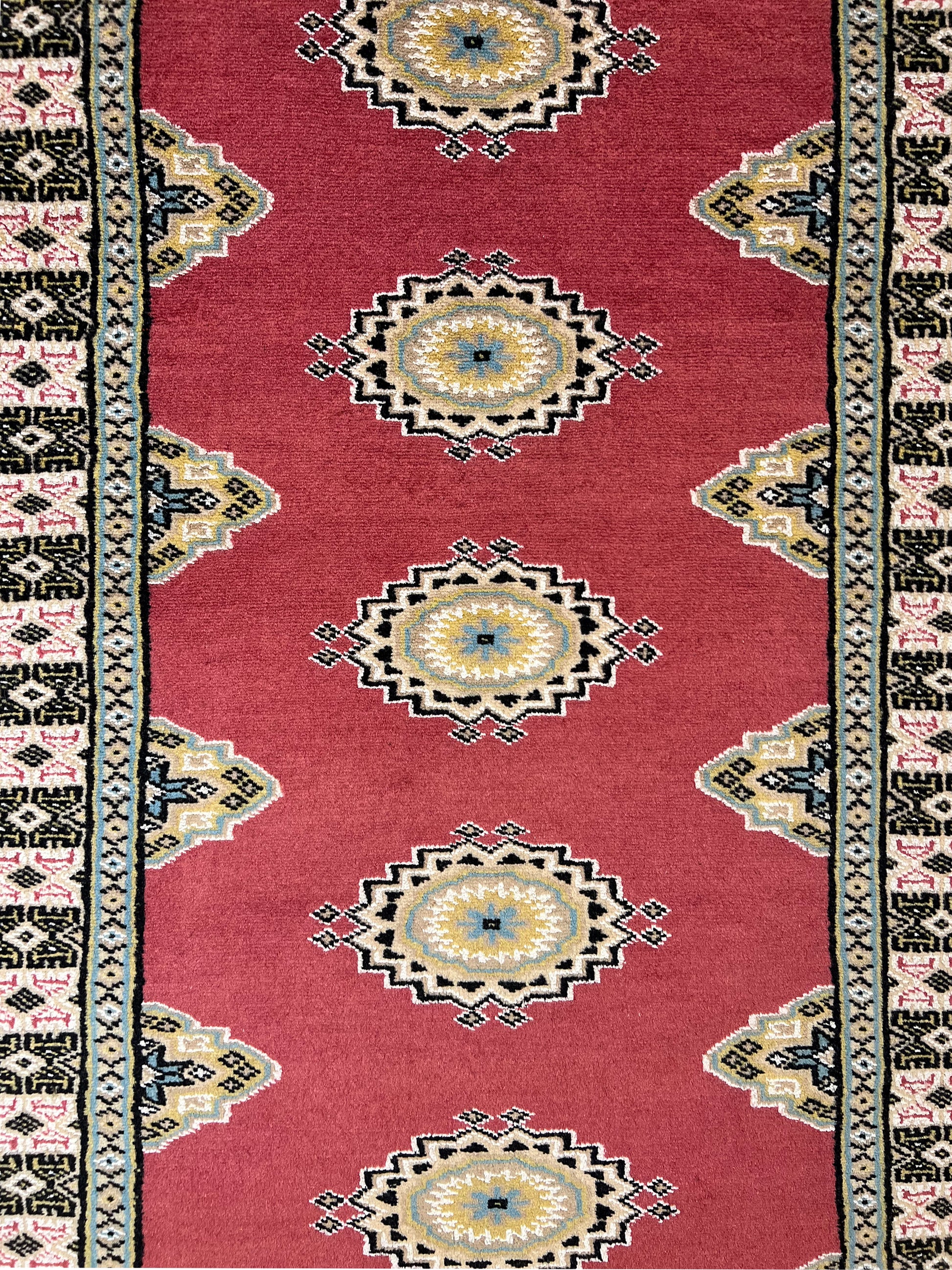 Bokhara is a term widely used in the West to refer to carpets and rugs made by various Turkmen tribes of Central Asia. Their history dates back centuries. The Turkomans were situated to the north of what is now called Afghanistan. During the early 1900s, the name of Bukhara, a city in Uzbekistan, was given to these rugs. The Turkomans were an industrious people who would barter their trade for food, clothing, etc. As a result, their weaving would invariably show up in bazaars (a type of market) in cities such as Bukhara, hence the name. The city did serve as a transit point for some Turkmen rugs on their way to the West. Nowadays, Bokharas are considered among the finest carpets in Afghanistan and Pakistan, distinguished by their extra fine knots and soft, silky touch. They are also popular worldwide due to their suitability to almost any space.