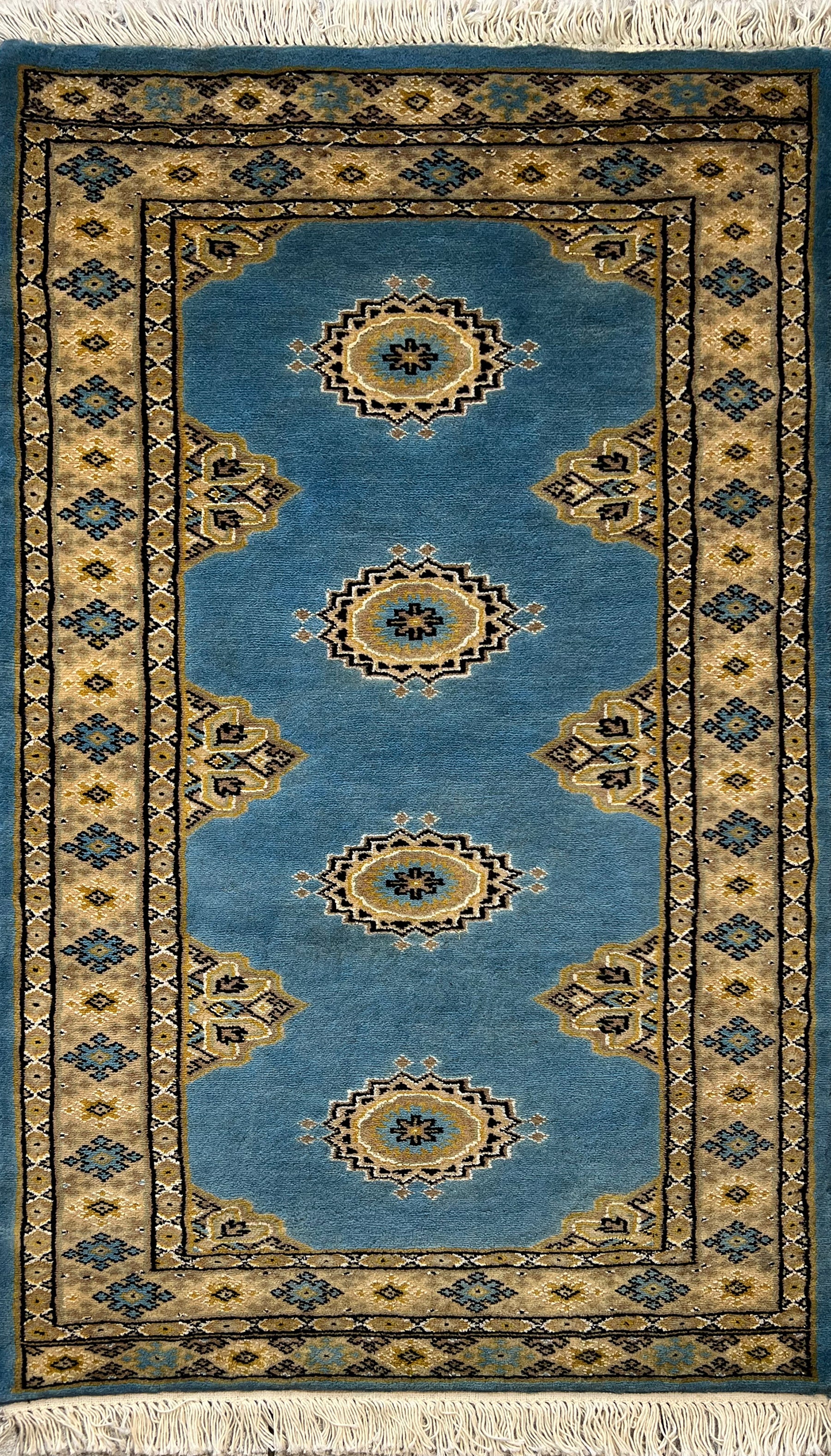 Bokhara is a term widely used in the West to refer to carpets and rugs made by various Turkmen tribes of Central Asia. Their history dates back centuries. The Turkomans were situated to the north of what is now called Afghanistan. During the early 1900s, the name of Bukhara, a city in Uzbekistan, was given to these rugs. The Turkomans were an industrious people who would barter their trade for food, clothing, etc. As a result, their weaving would invariably show up in bazaars (a type of market) in cities such as Bukhara, hence the name. The city did serve as a transit point for some Turkmen rugs on their way to the West. Nowadays, Bokharas are considered among the finest carpets in Afghanistan and Pakistan, distinguished by their extra fine knots and soft, silky touch. They are also popular worldwide due to their suitability to almost any space.