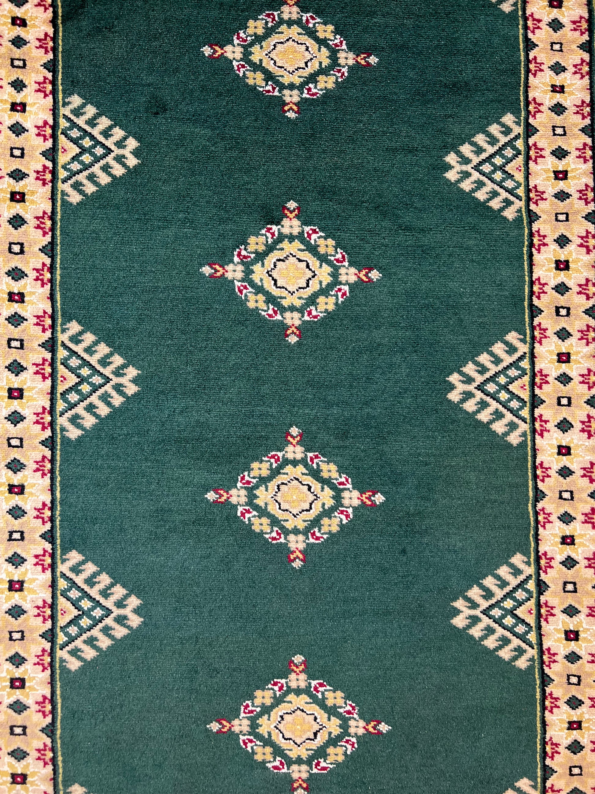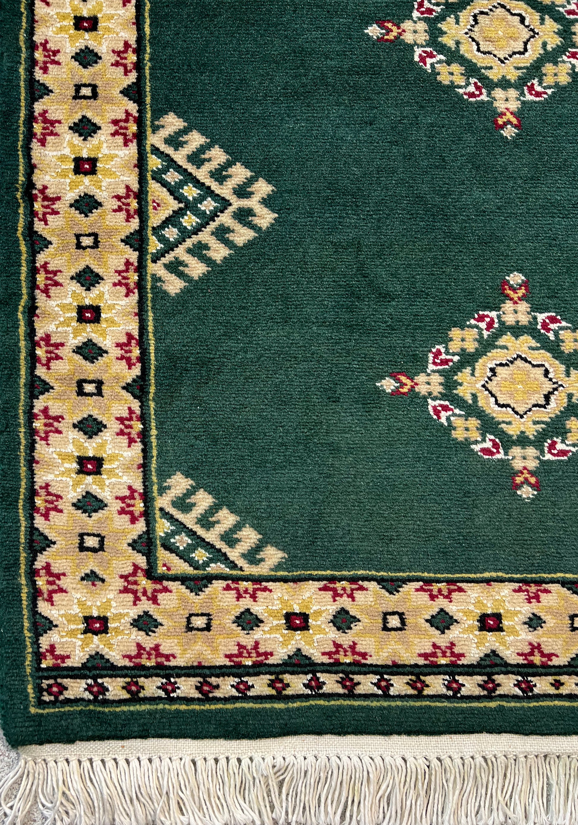 Bokhara is a term widely used in the West to refer to carpets and rugs made by various Turkmen tribes of Central Asia. Their history dates back centuries. The Turkomans were situated to the north of what is now called Afghanistan. During the early 1900s, the name of Bukhara, a city in Uzbekistan, was given to these rugs. The Turkomans were an industrious people who would barter their trade for food, clothing, etc. As a result, their weaving would invariably show up in bazaars (a type of market) in cities such as Bukhara, hence the name. The city did serve as a transit point for some Turkmen rugs on their way to the West. Nowadays, Bokharas are considered among the finest carpets in Afghanistan and Pakistan, distinguished by their extra fine knots and soft, silky touch. They are also popular worldwide due to their suitability to almost any space.