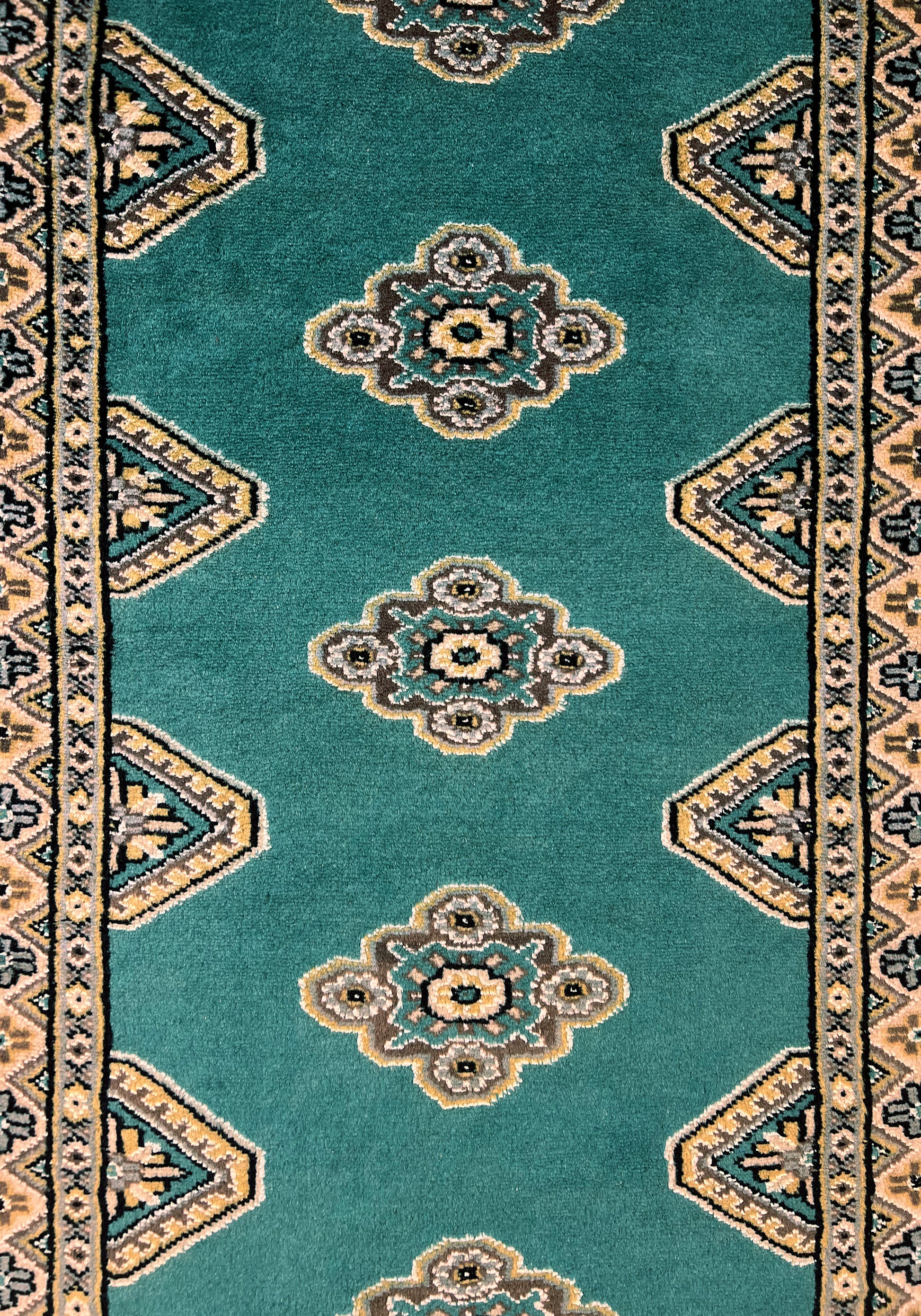Bokhara is a term widely used in the West to refer to carpets and rugs made by various Turkmen tribes of Central Asia. Their history dates back centuries. The Turkomans were situated to the north of what is now called Afghanistan. During the early 1900s, the name of Bukhara, a city in Uzbekistan, was given to these rugs. The Turkomans were an industrious people who would barter their trade for food, clothing, etc. As a result, their weaving would invariably show up in bazaars (a type of market) in cities such as Bukhara, hence the name. The city did serve as a transit point for some Turkmen rugs on their way to the West. Nowadays, Bokharas are considered among the finest carpets in Afghanistan and Pakistan, distinguished by their extra fine knots and soft, silky touch. They are also popular worldwide due to their suitability to almost any space.