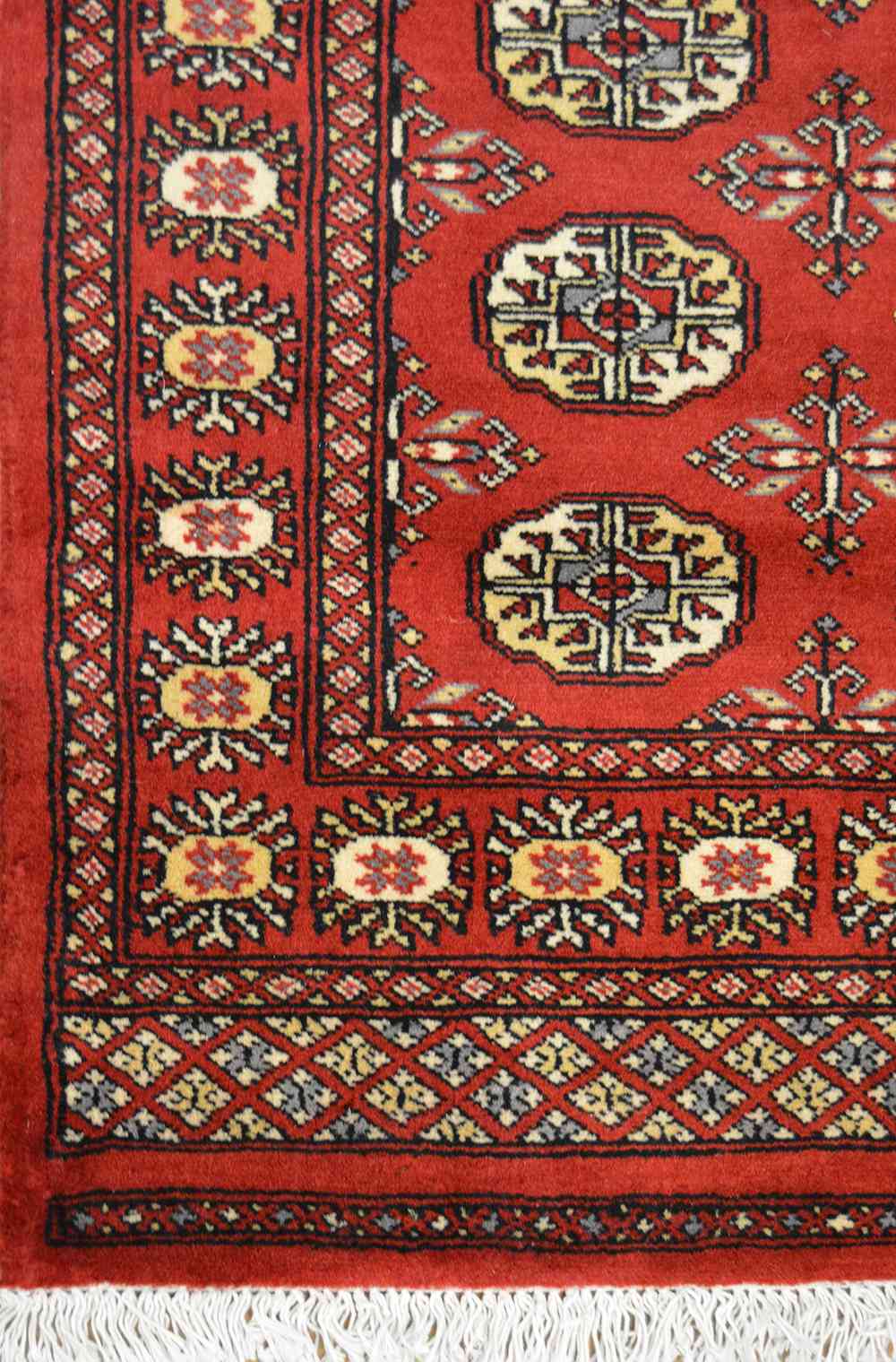 Tekke Bokharas, also called Royal Bokharas since the mid-19th century, are what most people imagine when we refer to Bokharas in general. They are similar to Mauri Bokharas, with their symmetrical columns of elephantÕs foot motifs (gul designs), but are distinguished by the addition of butterfly-shaped figures that alternate within guls. These rugs are one of the most popular types of hand-knotted carpets in the world due to their soft and silky feel and suitability to almost any space. They also are the most popular type of Pakistani rug.This elegant runner rug features a classic crimson red field and rows of elephantÕs foot guls in canary gold. It is hand-knotted in pure wool by weavers residing at the foothills of the Himalayan mountain range. It embodies the traditional aesthetic found in carpets from the Caucus region. Its all-over design enhances any room with its pleasing symmetry.