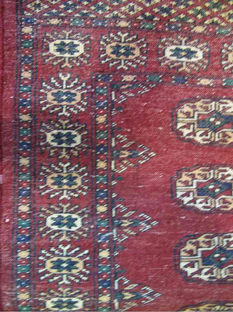 Bokhara carpets contain a repeating motif known as the "gul" which are commonly found on its main field in larger sizes and found on its borders in smaller sizes. A gul (also spelled as gol, göl or gül) is a medallion-like motif typically found in traditional hand-woven carpets from Central Asia, West Asia and parts of South Asia. These motifs are very ancient and animistic in origin, pre-dating Islamic and Christian times. The origin of the term is uncertain and it is disputed to this day. In Farsi, the language spoken in modern day Iran, it is said to mean "flower" or "rose". Meanwhile in the Turkish language, the term gül means a "rose" or a "roundel" or even a "lake".
