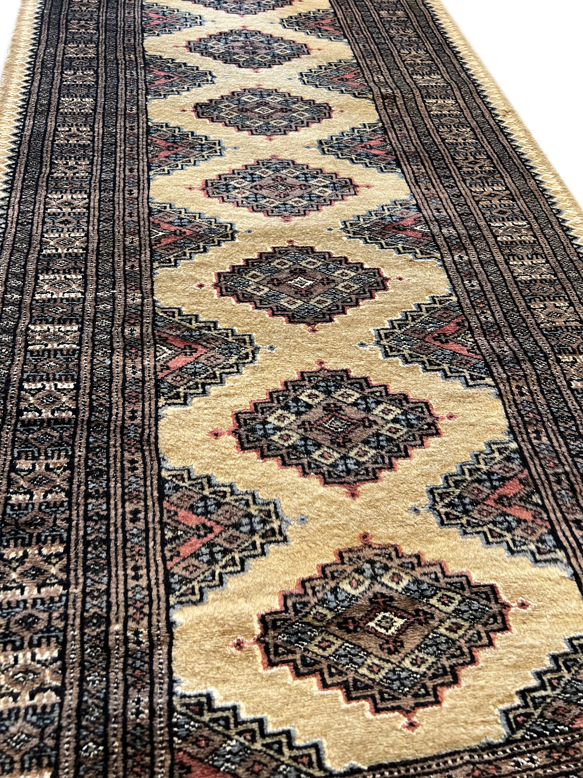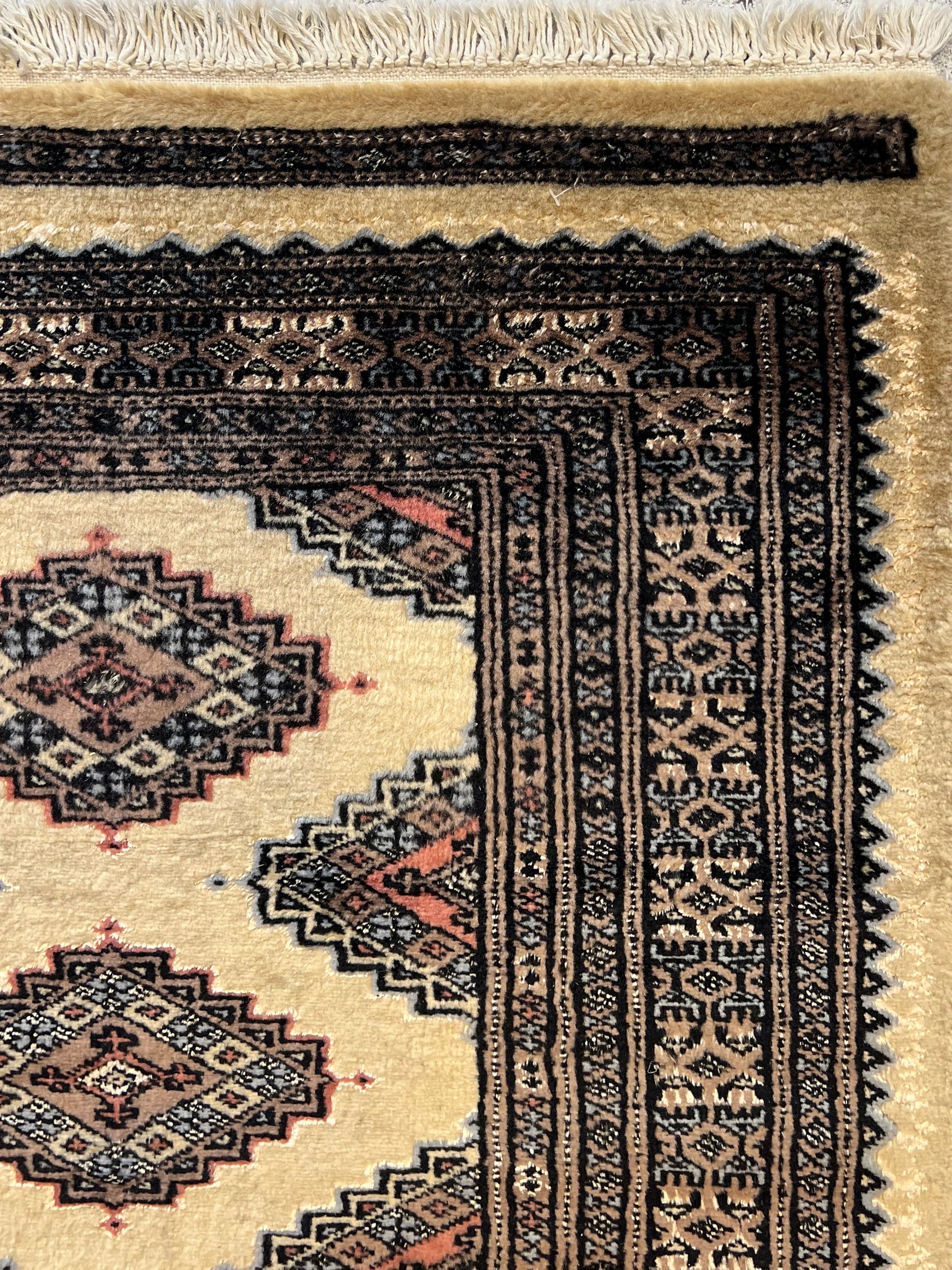 Bokhara is a term widely used in the West to refer to carpets and rugs made by various Turkmen tribes of Central Asia. Their history dates back centuries. The Turkomans were situated to the north of what is now called Afghanistan. During the early 1900s, the name of Bukhara, a city in Uzbekistan, was given to these rugs. The Turkomans were an industrious people who would barter their trade for food, clothing, etc. As a result, their weaving would invariably show up in bazaars (a type of market) in cities such as Bukhara, hence the name. The city did serve as a transit point for some Turkmen rugs on their way to the West. Nowadays, Bokharas are considered among the finest carpets in Afghanistan and Pakistan, distinguished by their extra fine knots and soft, silky touch. They are also popular worldwide due to their suitability to almost any space.