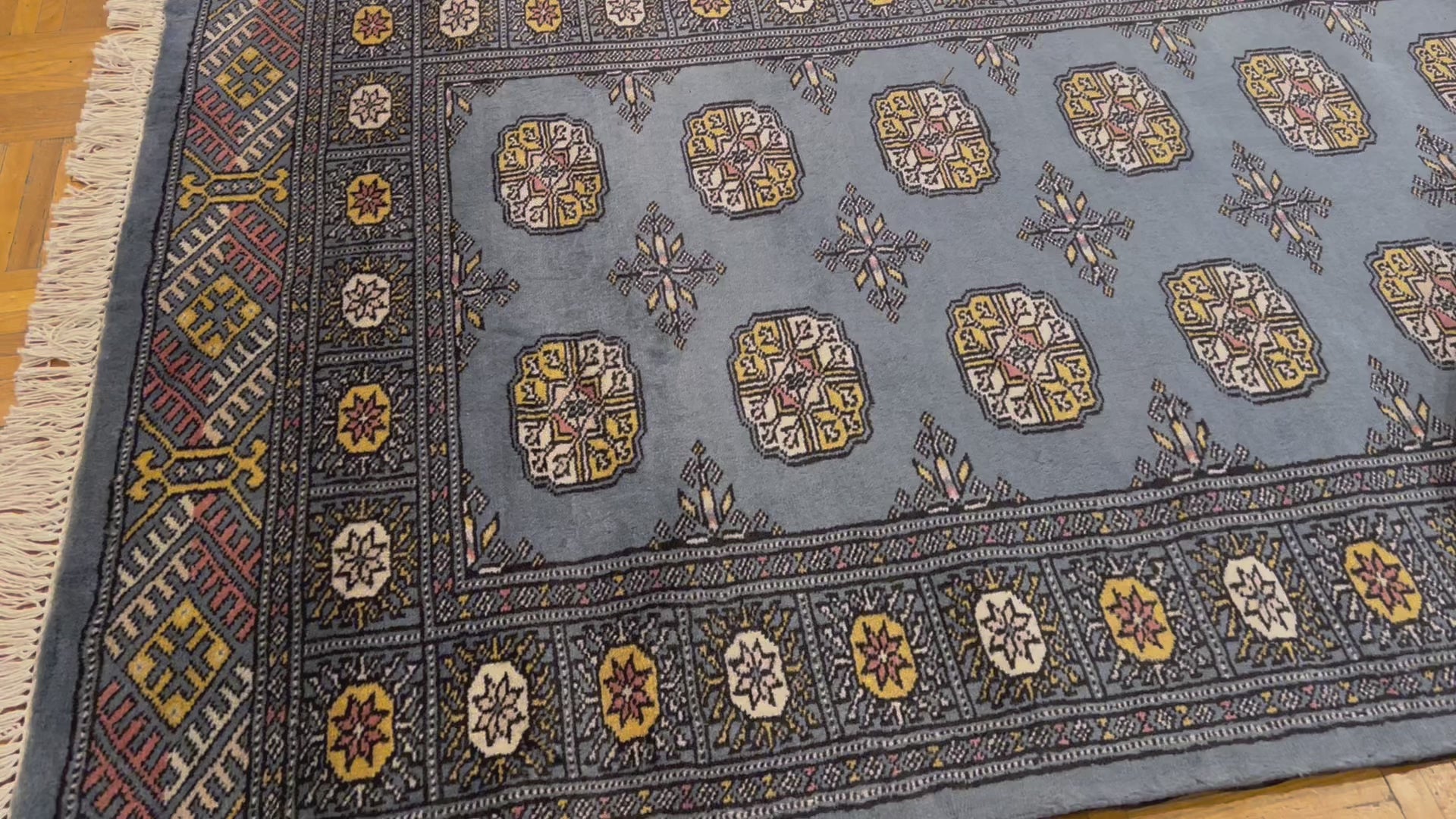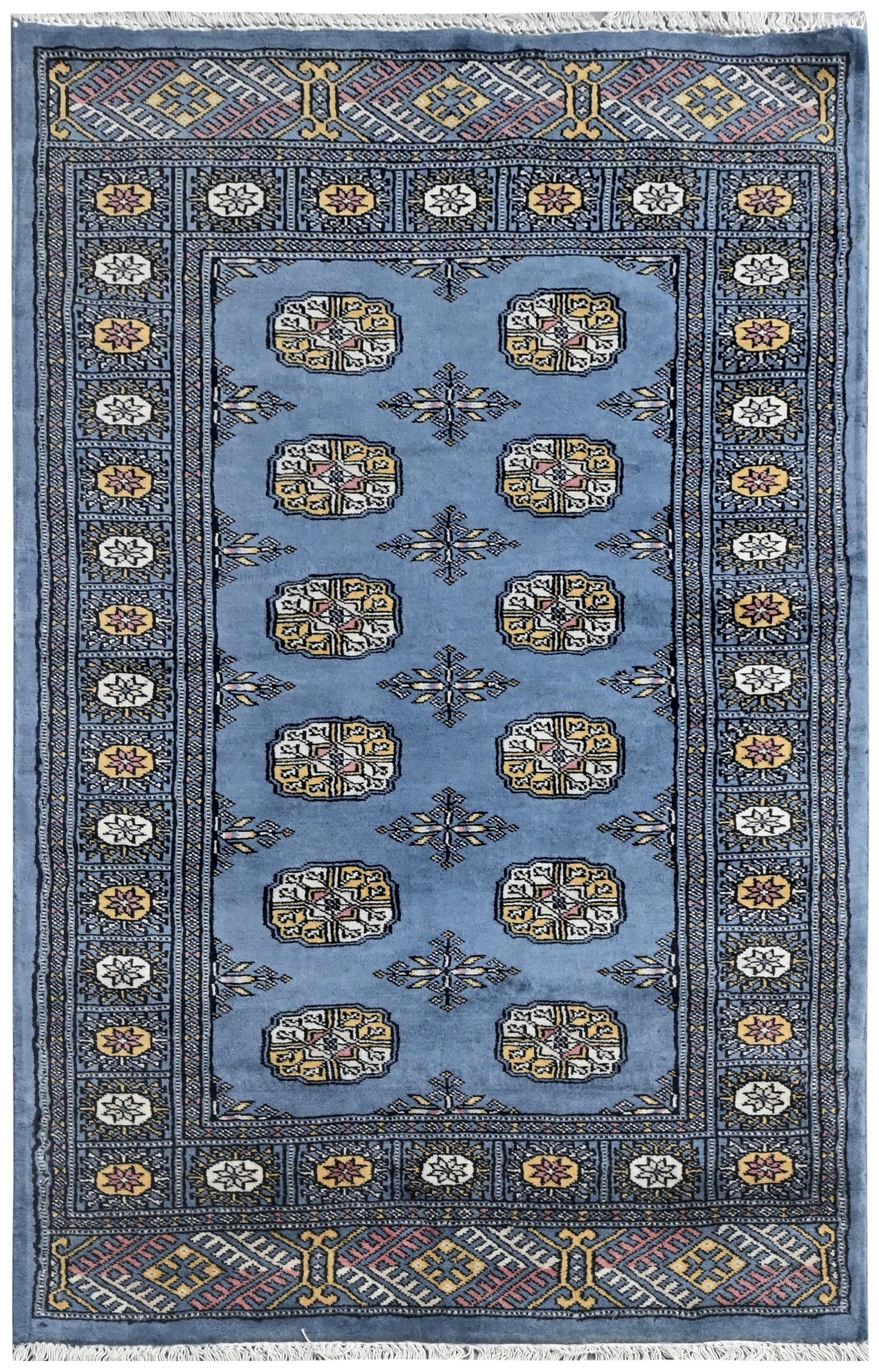 Bokhara is a term widely used in the West to refer to carpets and rugs made by various Turkmen tribes of Central Asia. Their history dates back centuries. The Turkomans were situated to the north of what is now called Afghanistan. During the early 1900s, the name of Bukhara, a city in Uzbekistan, was given to these rugs. The Turkomans were an industrious people who would barter their trade for food, clothing, etc. As a result, their weaving would invariably show up in bazaars (a type of market) in cities such as Bukhara, hence the name. The city did serve as a transit point for some Turkmen rugs on their way to the West. Nowadays, Bokharas are considered among the finest carpets in Afghanistan and Pakistan, distinguished by their extra fine knots and soft, silky touch. They are also popular worldwide due to their suitability to almost any space.