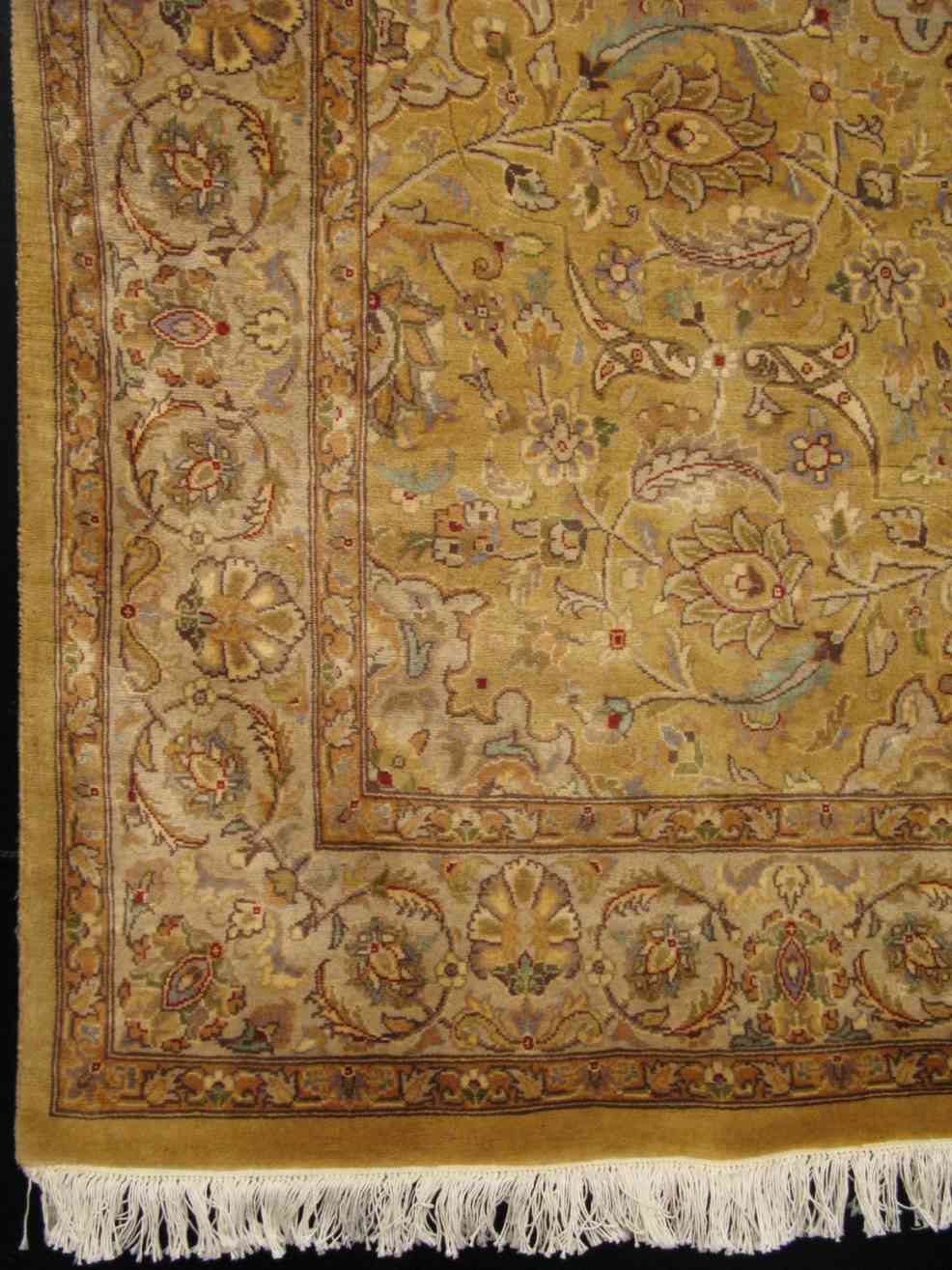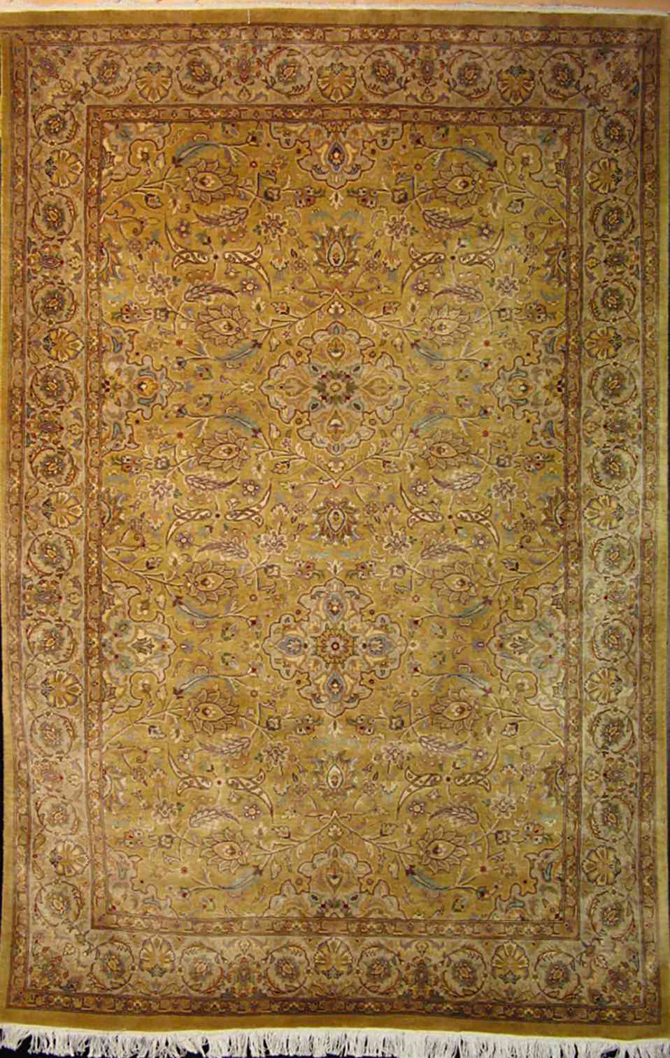 Ghoum rugs, also known as Ghoum, Gom, Qom, Qum, Qoum, Kum or Koum, are woven in workshops of Qom, a city located in northwest central Iran. Since rug production did not begin in Qom until the 1930s, Qom doesn't have any traditional designs of its own. Qom weavers prefer to weave the most favorable designs of other Persian weaving groups and sometimes Caucasian weaving groups and adjusting these designs to their own taste. It is possible for Qom rugs to be mistaken with Kashan or Esfahan rugs. However, they will not be mistaken with Tabriz rugs because Qum, Kashan and Esfahan rugs are woven with the asymmetric (Persian) knot and Tabriz rugs are woven with the symmetric (Turkish) knot.