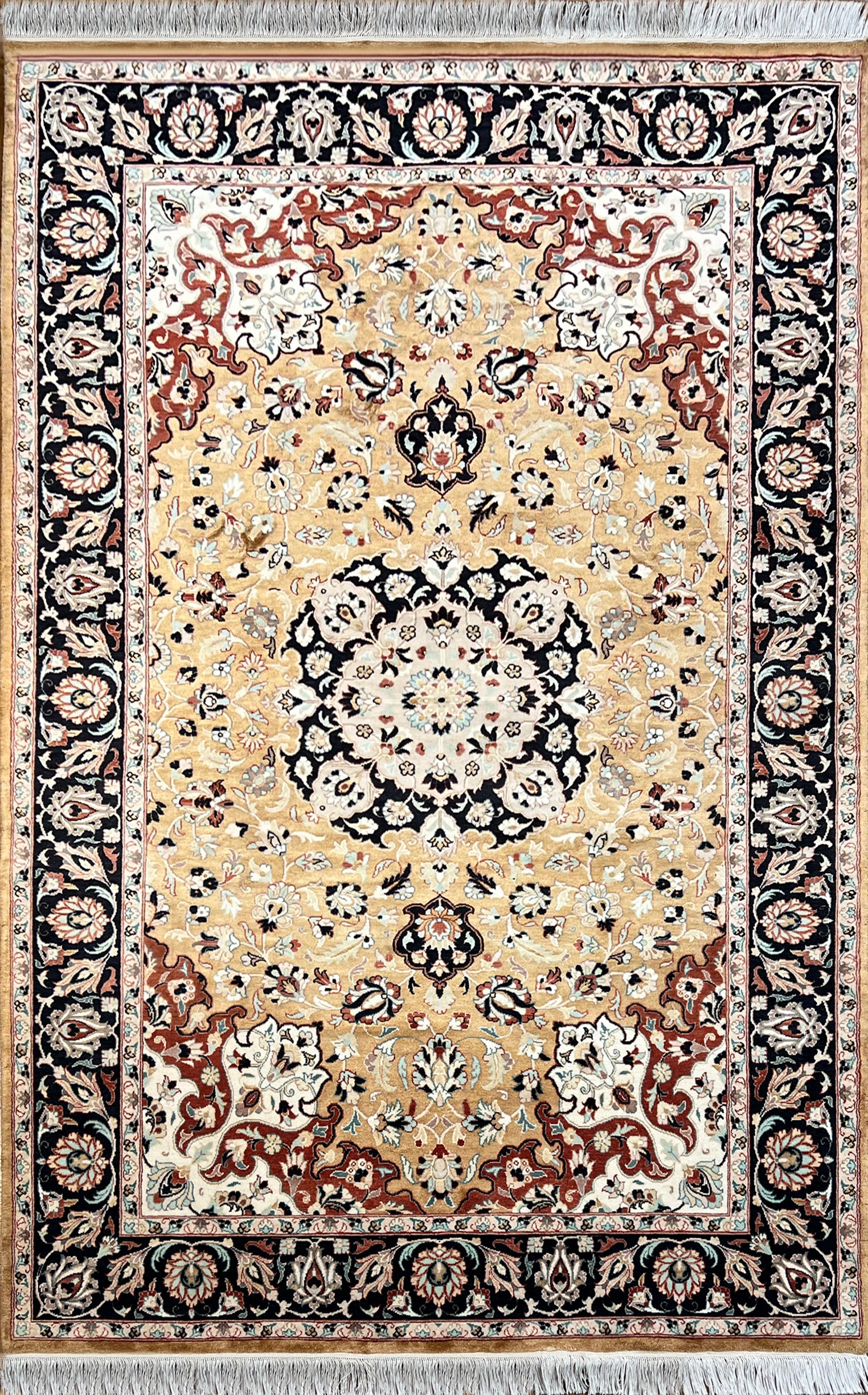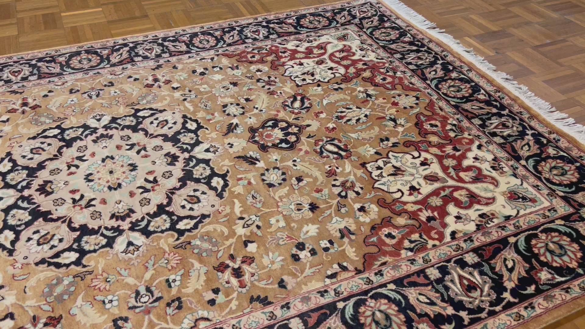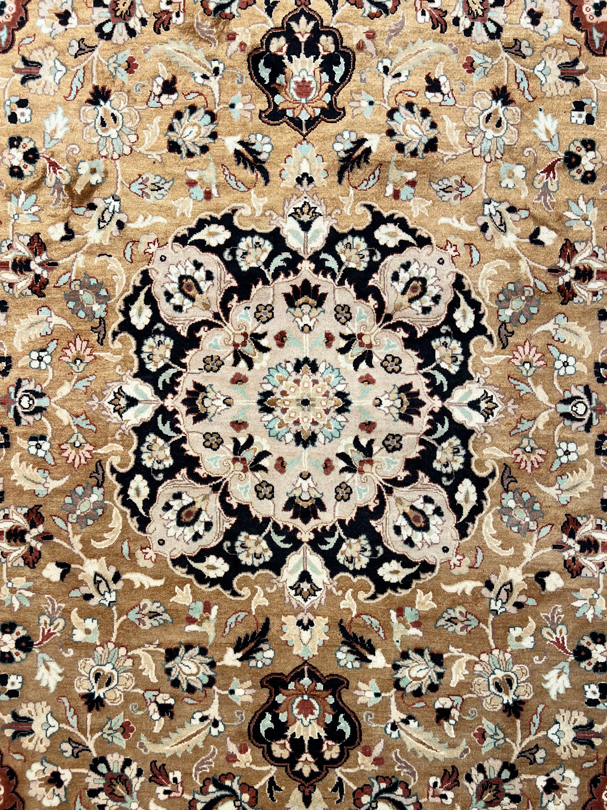 The finishing of this carpet was done using centuries old traditional techniques. Once its laborious hand-knotting was completed, it was rolled and entirely submerged in a sanitizing bath where its fibers fully absorbed all cleaning liquid. After which it was laid flat on the ground where a team of cleaners used wooden oar-like paddles to push the water through its fibers and draw out impurities. Oar strokes were done in sync to prevent the carpet from getting torn. Each stroke tightened the knots even further. No machines were involved in its washing or drying.