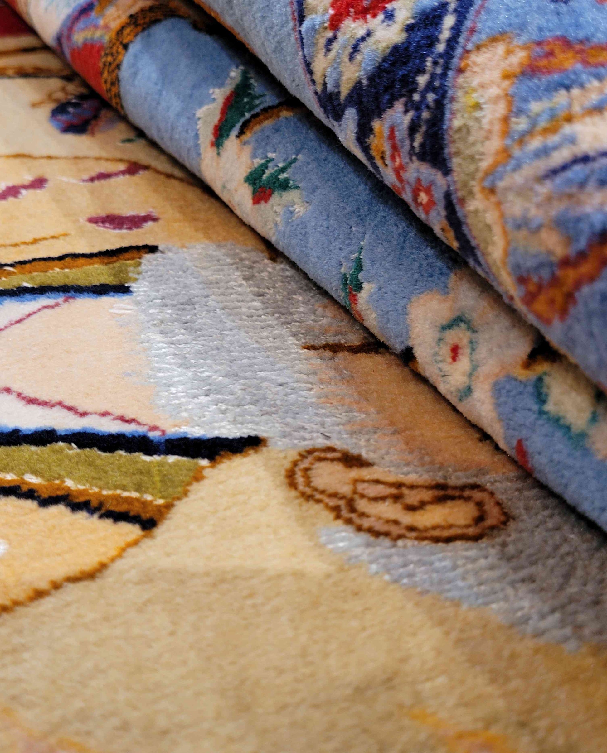 The designs and samples of pictorial carpets are completely different from traditional Oriental or Persian floor rugs which usually showcase all over patterns filled with lush vine scrolls, medallions at their center or adorn geometric motifs. One can find a wide variety of scenes on pictorial carpets such as hunting scenes, the four seasons, people, faces, animals, statues, figurines, French gardens, Persian miniatures, poems, folk stories and religious themes from the Torah, Bible and the Koran Sometimes these pieces are made to pay homage to various statesman, ministers, kings and national heroes. At times, some are commissioned to commemorate special battles, wars and other important events in world history. The first evidence of a pictorial rug design dates back to the 9th century BCE and their production mostly blossomed at the end of the 19th century in Iran particularly in the cities of Isfahan, Kirman, Qum and Tabriz. Some pictorial carpets are more tribal in nature and are made of a much coarser wool and seldom contain any silk. Their pile is thicker and their knots per square inch are lower.