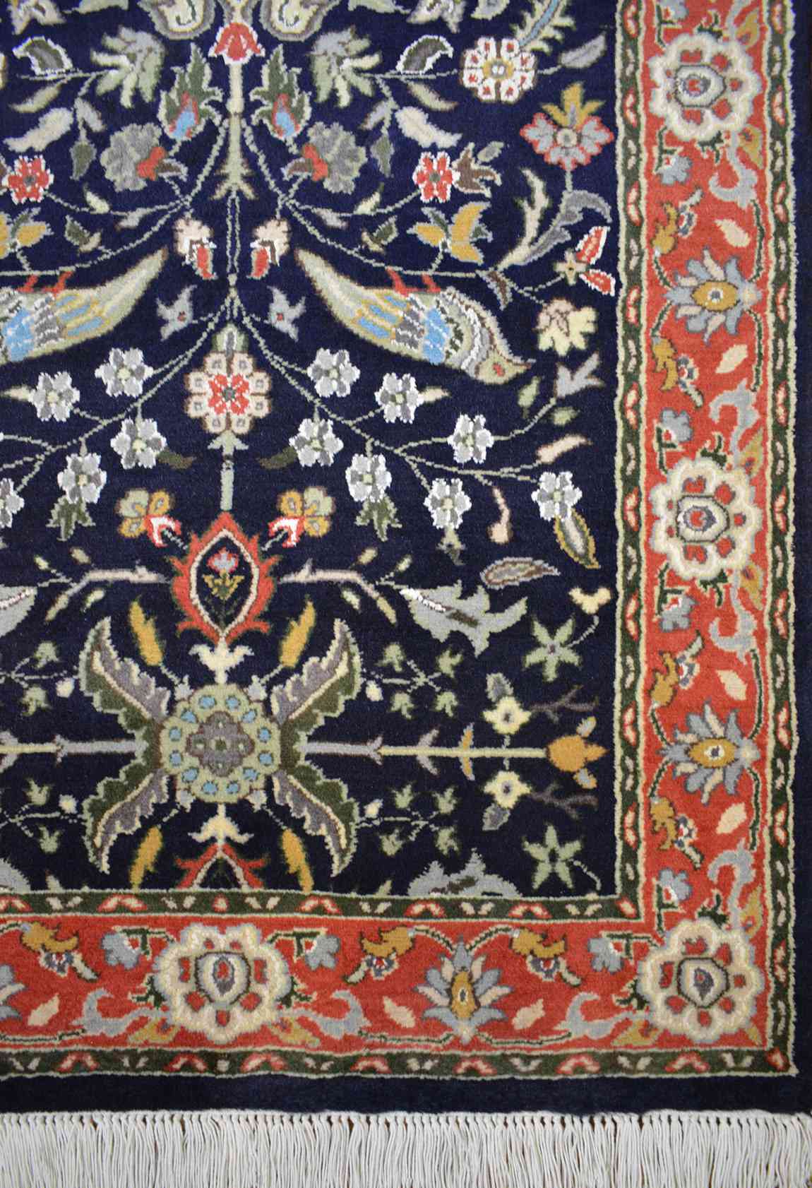 The Mughal emperors Shah Jahan (1627-1658) and Shah Aurangzeb (1658-1707) had a great appreciation for this particular style and they commissioned their weavers to replicate these fine delicate motifs in the carpets that adorned their palaces throughout India. In 1730 the Persian Shah Nadir Quli (1688-1747) conquered parts of India and returned home with countless treasures, including textiles and Millefleurs carpets. This made a great impact on the decorative arts of Persia and the surrounding territories.