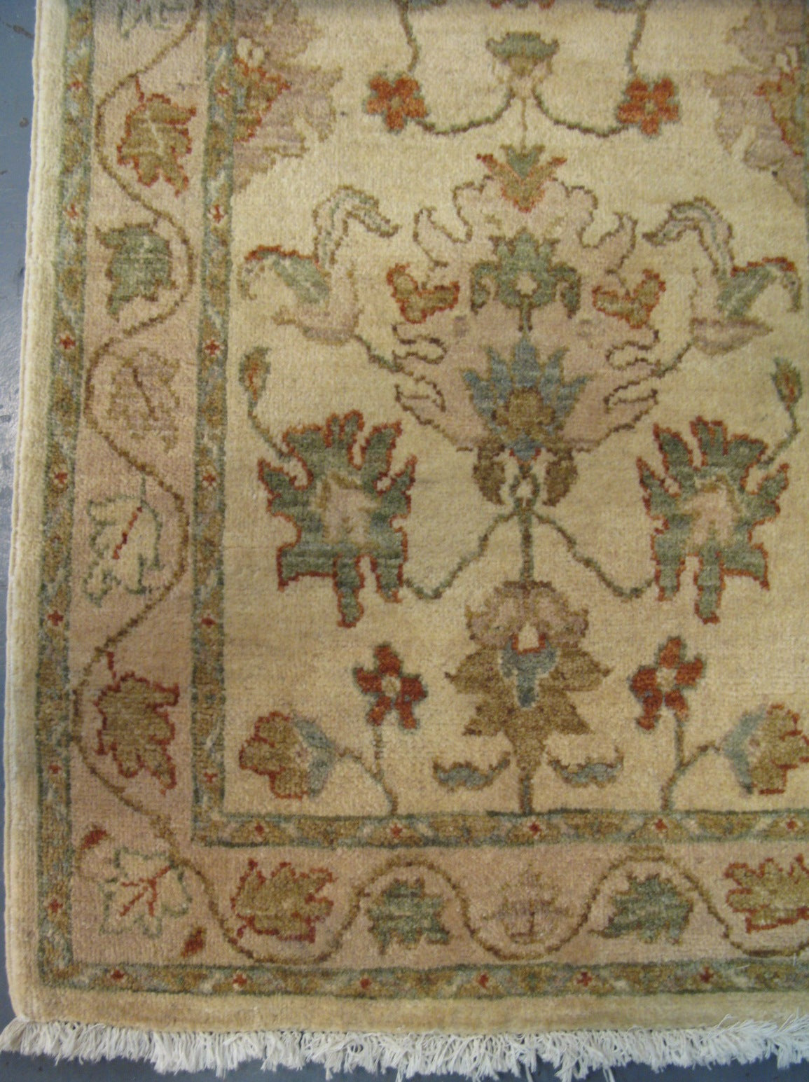 The finishing of this carpet was done using centuries old traditional techniques. Once its laborious hand-knotting was completed, it was rolled and entirely submerged in a sanitizing bath where its fibers fully absorbed all cleaning liquid. After which it was laid flat on the ground where a team of cleaners used wooden oar-like paddles to push the water through its fibers and draw out impurities. Oar strokes were done in sync to prevent the carpet from getting torn. Each stroke tightened the knots even further. No machines were involved in its washing or drying.