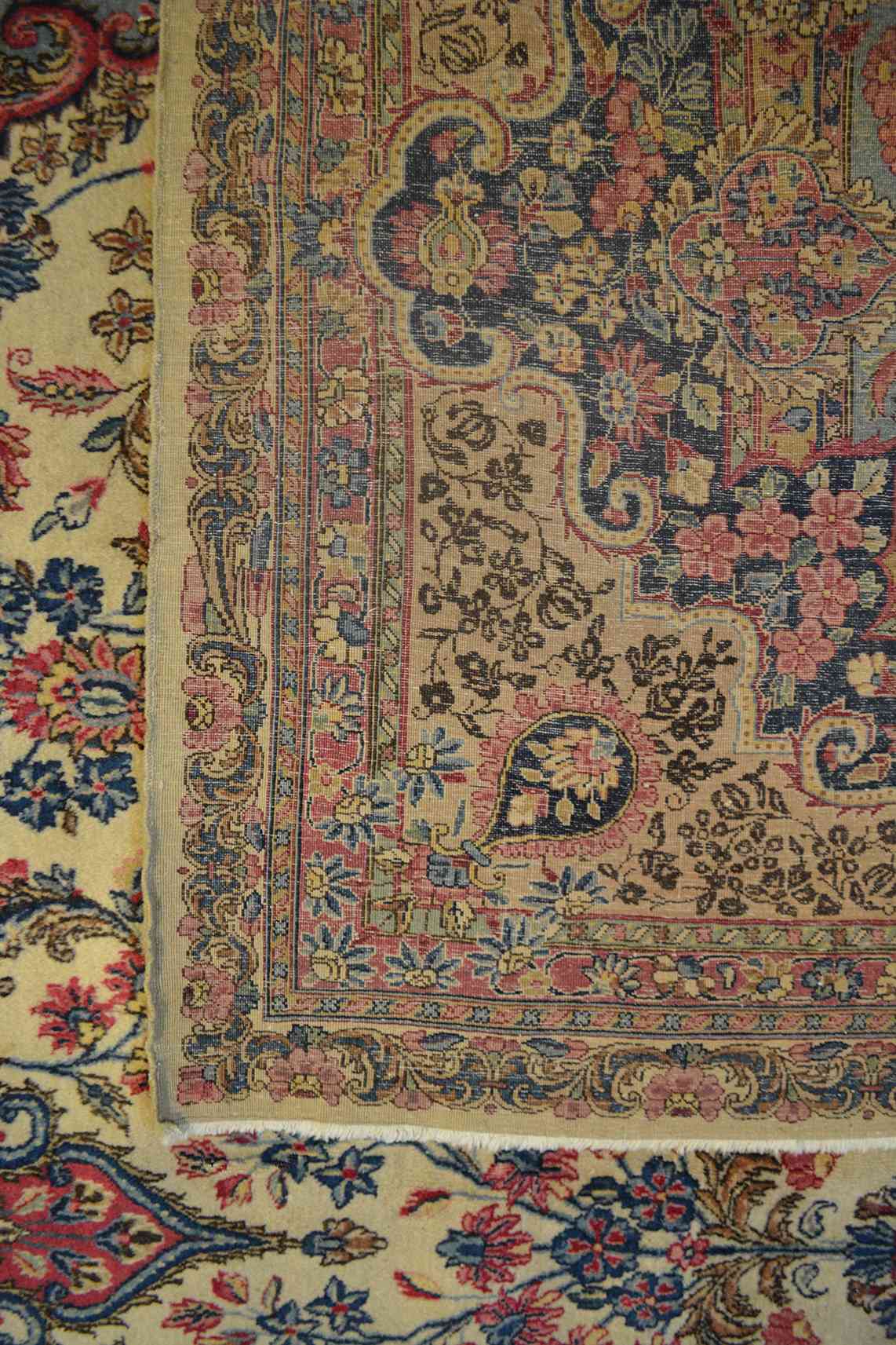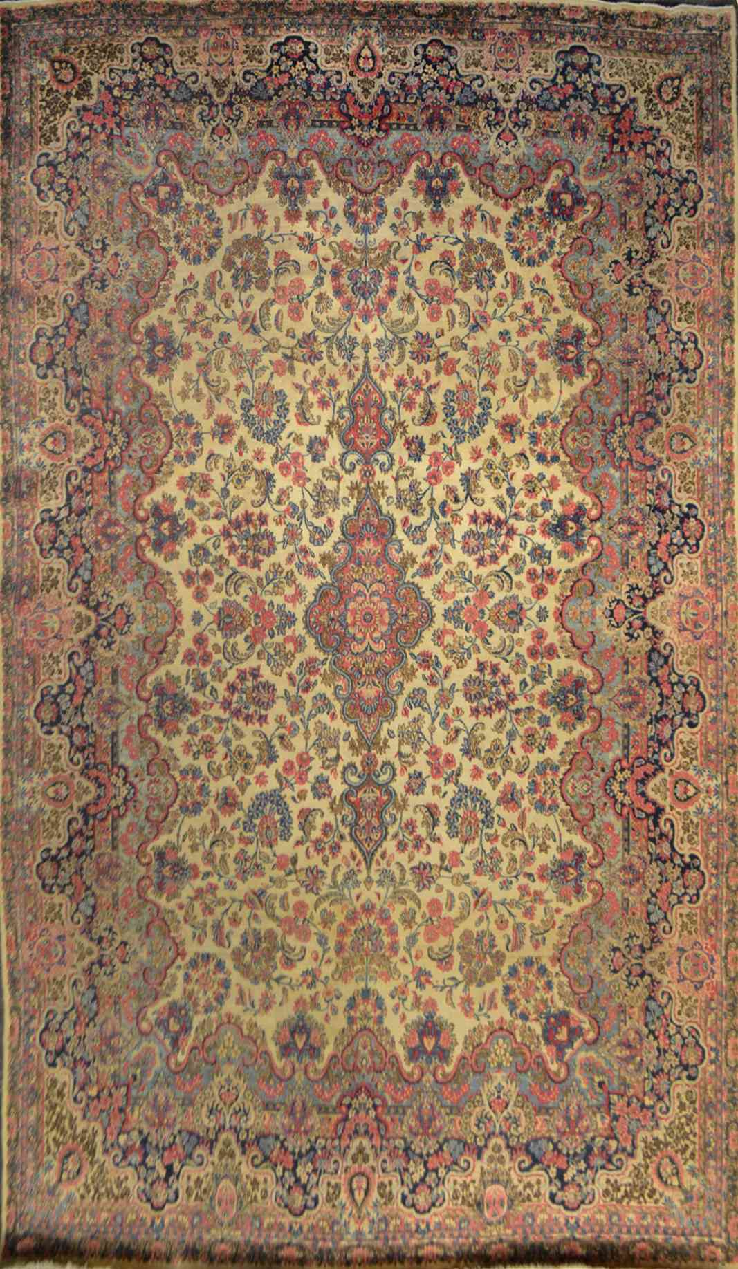 It is often hard to pinpoint exactly what constitutes a Carmania design, as the motifs and patterns used are typical of many centres of Persian carpet production. Floral medallions and corner motifs are popular, as are flowering tree patterns and pictorial hunting designs. Pale washed-out colours such as beige and white are typical. The Lavar is a very finely knotted large piece, with an unusual overall small floral pattern on an ivory field. It was possibly made specially to order. Lavar is now the accepted term for carpets produced in Ravar, near Carmania. Lavar was originally a misspelling. They are a particular kind of Carmania which, although quite rare, are famous for the superb quality of the weave. Typically woven in pinky colours, Lavars are very popular in America.