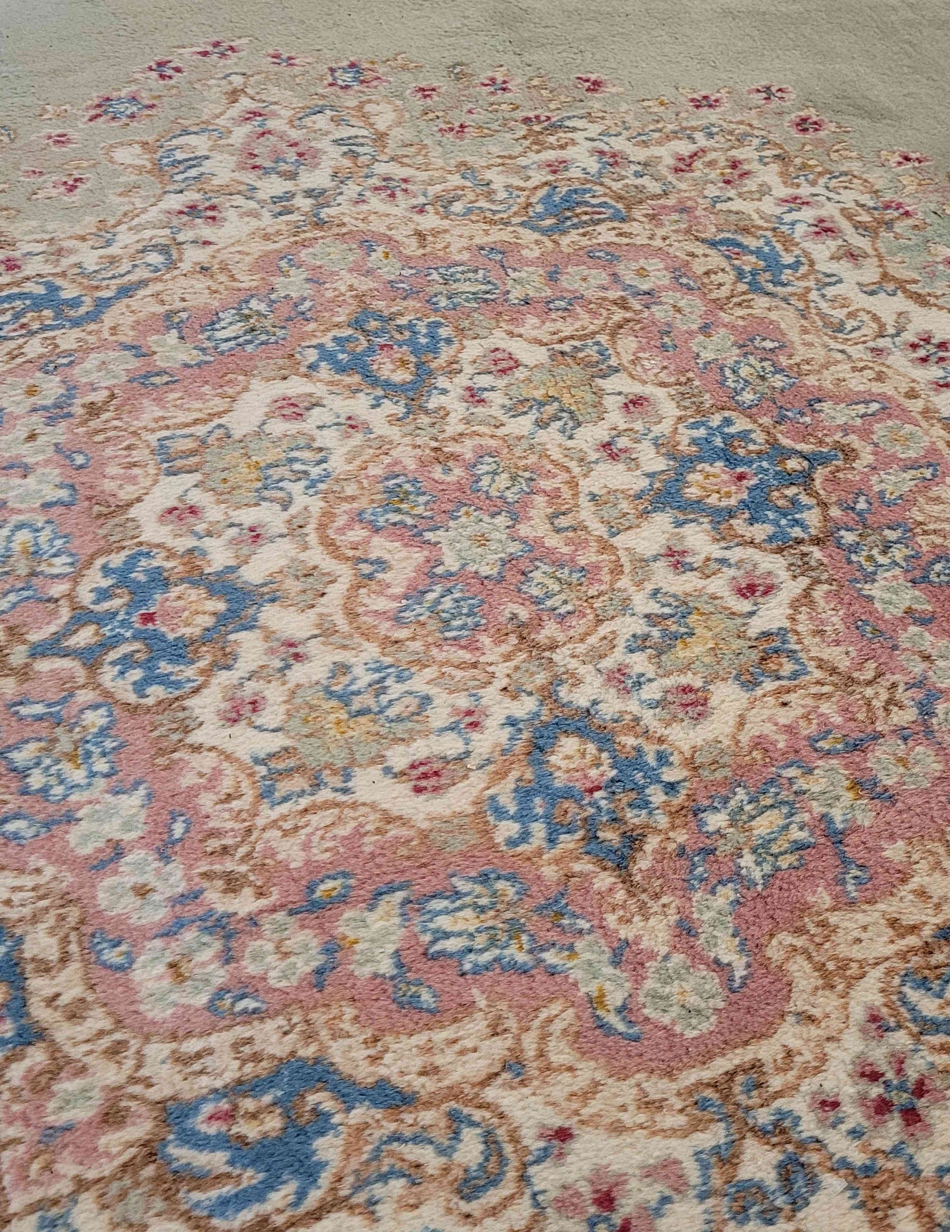 It is often hard to pinpoint exactly what constitutes a Carmania design, as the motifs and patterns used are typical of many centres of Persian carpet production. Floral medallions and corner motifs are popular, as are flowering tree patterns and pictorial hunting designs. Pale washed-out colours such as beige and white are typical. The Lavar is a very finely knotted large piece, with an unusual overall small floral pattern on an ivory field. It was possibly made specially to order. Lavar is now the accepted term for carpets produced in Ravar, near Carmania. Lavar was originally a misspelling. They are a particular kind of Carmania which, although quite rare, are famous for the superb quality of the weave. Typically woven in pinky colours, Lavars are very popular in America.